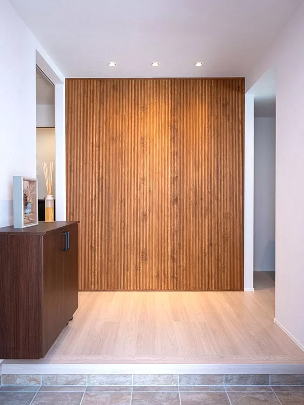 「友人が来たときに、家にあがって『おおっ』と思ってもらえるような玄関やリビングにしたかったので、ちょっと見栄を張りました(笑)」と、笑顔で話すS様。その言葉どおり、広々とした玄関ホールは、訪れた人が思わず感嘆の声をあげてしまうような開放感と上質感に満ちた空間です。担当者からの提案で取り入れた木製のアクセントウォールは、やわらかな木目が美しく、温もりを感じさせるデザインでひと際目を引きます。家族写真を撮るのにもぴったりの“映えスポット”となり、日常の一コマを特別に彩ってくれます。お客様を迎える場としても印象深く、家の第一印象をぐっと引き上げています。