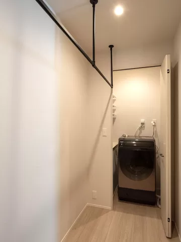 「うちは共働き世帯なので、洗濯物は室内干しが基本です。洗面室にランドリールームを併設すると、一日中洗濯物が干しっぱなしになり雑然とした印象になると思い、玄関の横に独立させました」