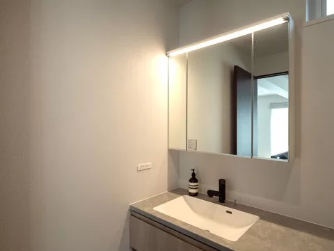 リビングからつながる洗面脱衣室には洗濯機がないので、常にすっきりと整った状態を保て来客の際にも安心。メリハリの効いた空間設計は、快適さと美しさを両立させたS様邸ならではの大きな魅力となっています。