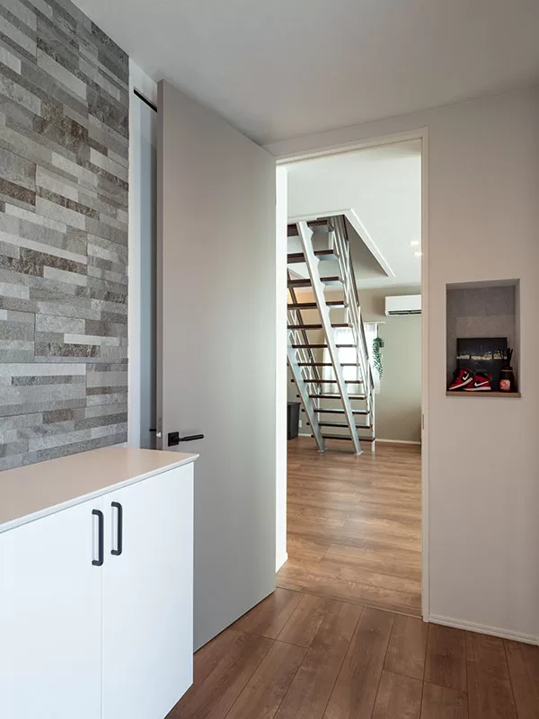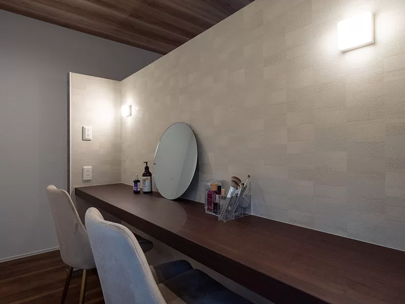 壁紙や照明選びにおいても、妥協せずにSNSで見つけたデザインを積極的に取り入れたご夫妻。「壁紙には課金しまくりでした」と笑うN様の言葉どおり、空間ごとに異なる質感や色味が楽しめます。特にリビング・ダイニングに採用した、大谷石を思わせるアクセントクロスは、完成見学会でも来場者の注目を集めた人気ポイント。素材感のある空間づくりに、ご夫妻のセンスの良さが光ります。